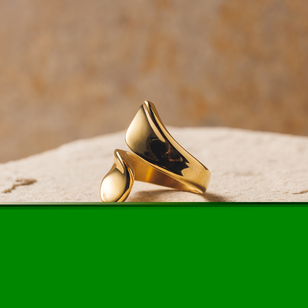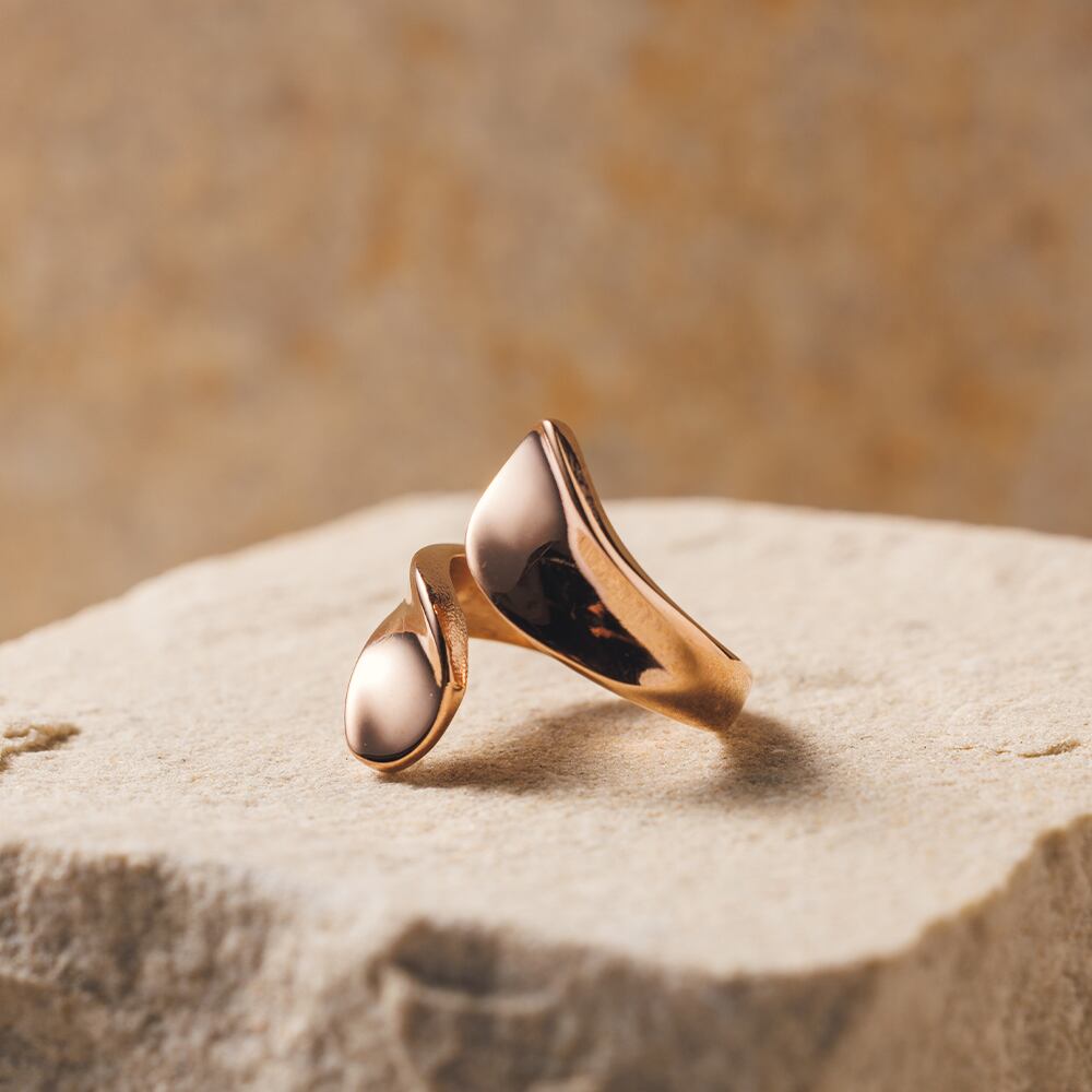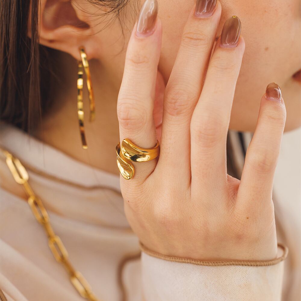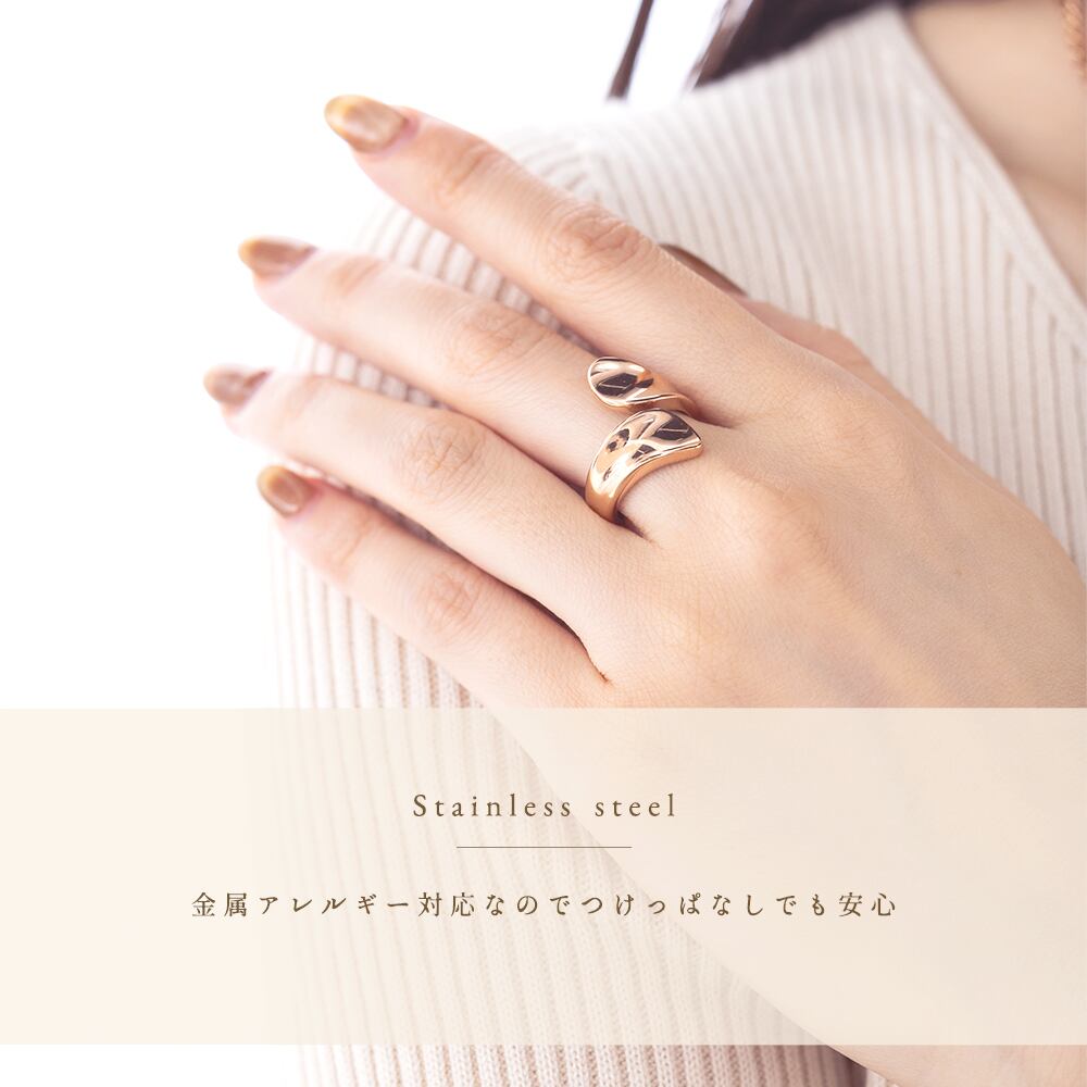 シンプルなプレートが交差するデザインが美しいリング。鏡面仕上げで輝きがあり、手元を美しく演出してくれます。